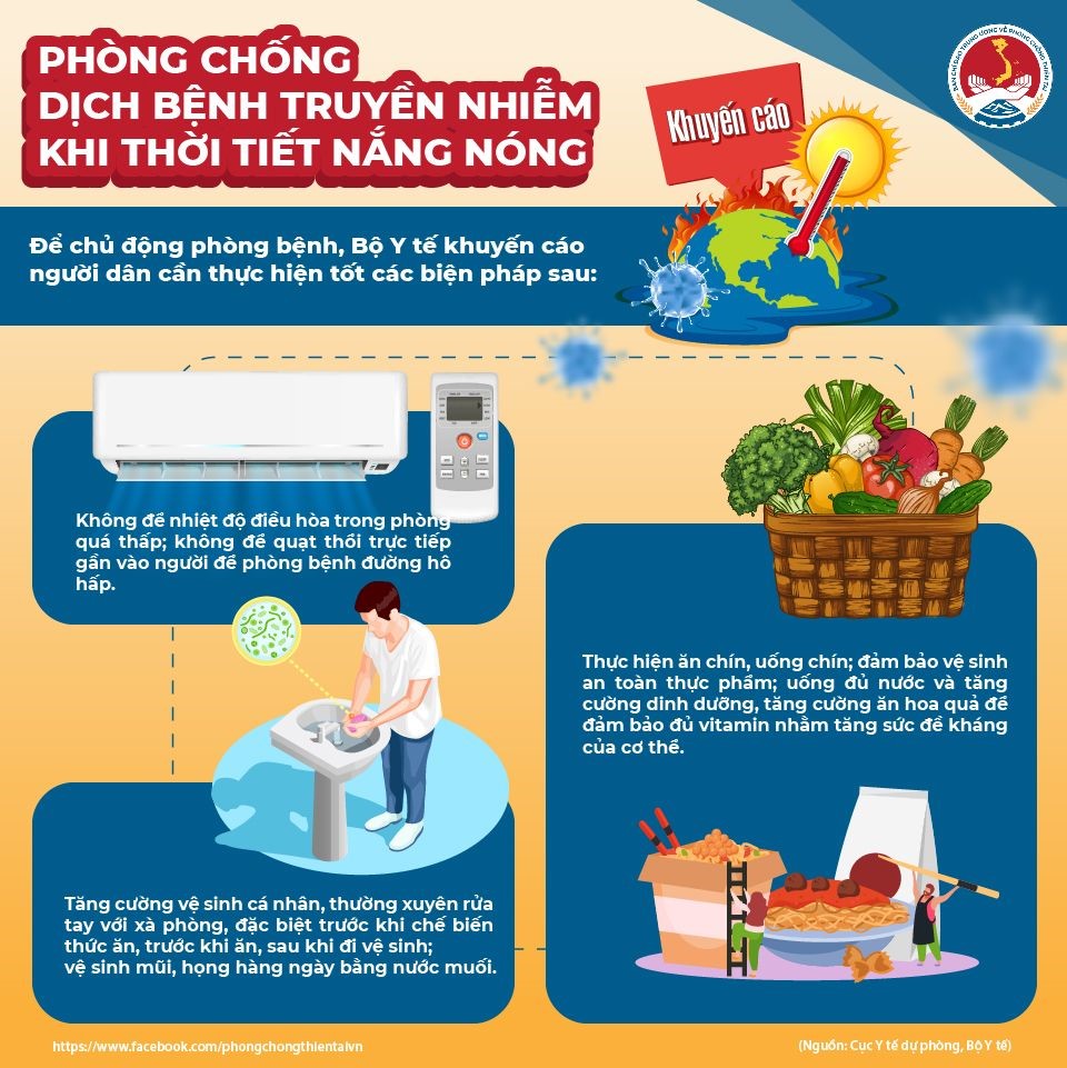 Nhiệt độ tăng cao, nắng nóng tạo điều kiện thuận lợi cho các loại vi-rút, vi khuẩn, côn trùng gây bệnh sinh sôi nảy nở. Các loại bệnh dễ mắc phải do nắng nóng như bệnh về đường hô hấp (viêm phổi, viêm họng, sốt vi-rút…), việc không đảm bảo vệ sinh an toàn thực phẩm là nguyên nhân gây các bệnh liên quan đến đường tiêu hóa (tiêu chảy).Để hạn chế tối đa những ảnh hưởng có hại đến sức khỏe trong mùa nắng nóng, người dân cần tăng cường áp dụng những biện pháp chống nắng, nóng: