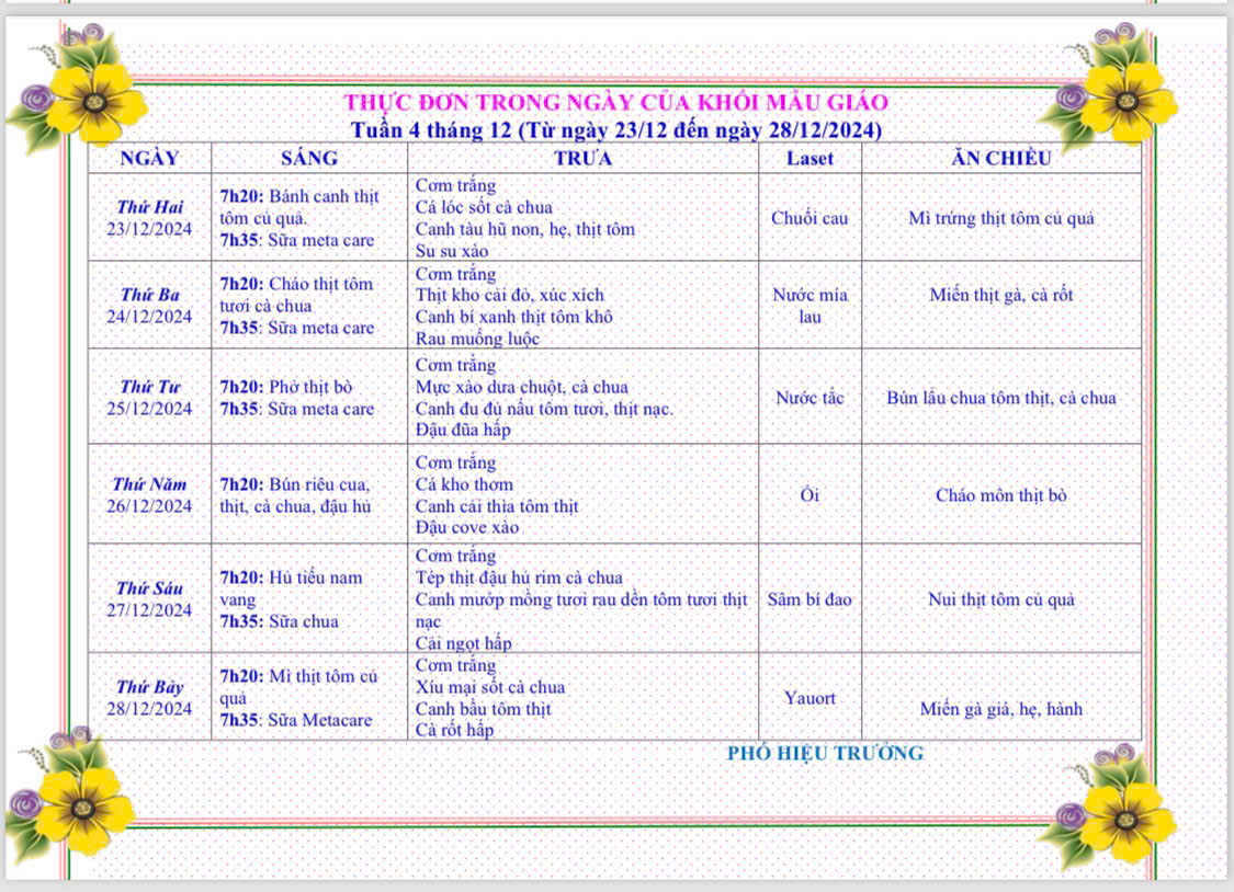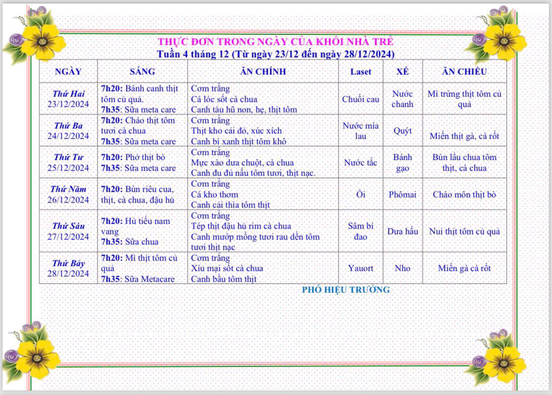 Bữa ăn của béThực đơn của bé từ ngày 23 đến ngày 28 tháng 12 năm 2024 Posted on 25/12/2024 by admin Xem thêm: THAM GIA THI GIÁO VIÊN GIỎI TỈNH NĂM HỌC 2024 – 2025 THỰC ĐƠN TỪ 10 THÁNG 11 ĐẾN 15 THÁNG 11 NĂM 2025 Tổng Bí thư: Quy hoạch thế nào mà có nơi không có trường học? Công tác phối hợp chăm sóc sức khỏe cho các bé năm học 2024 – 2025 Thực đơn cho các bé từ ngày 16 đến ngày 21 tháng 9 năm 2024 Bài viết cùng chủ đề: THỰC ĐƠN TỪ 1 THÁNG 12 ĐẾN 6 THÁNG 12 NĂM 2025 THỰC ĐƠN TỪ 24 THÁNG 11 ĐẾN 29 THÁNG 11 NĂM 2025 THỰC ĐƠN TỪ 17 THÁNG 11 ĐẾN 22 THÁNG 11 NĂM 2025 THỰC ĐƠN TỪ 10 THÁNG 11 ĐẾN 15 THÁNG 11 NĂM 2025 THỰC ĐƠN TỪ NGÀY 3 THÁNG 11 ĐẾN NGÀY 8 THÁNG 11 NĂM 2025 THỰC ĐƠN TỪ 27 THÁNG 10 ĐẾN NGÀY 1 THÁNG 11 NĂM 2025 THỰC ĐƠN TỪ NGÀY 20 THÁNG 10 ĐẾN NGÀY 25 THÁNG 10 NĂM 2025 THỰC ĐƠN TỪ 13 THÁNG 10 ĐẾN 18 THÁNG 10 NĂM 2025 THỰC ĐƠN TỪ 06 THÁNG 10 ĐẾN 11 THÁNG 10 NĂM 2025 THỰC ĐƠN TỪ 29 THÁNG 9 ĐẾN 4 THÁNG 10 NĂM 2025 THỰC ĐƠN TỪ NGÀY 22/9/2025 ĐẾN NGÀY 27/9/2025 THỰC ĐƠN TỪ NGÀY 15/9/2025 ĐẾN NGÀY 20/9/2025 THỰC ĐƠN TỪ NGÀY 8/9/2025 ĐẾN NGÀY 13/9/2025 THỰC ĐƠN TỪ NGÀY 1/9/2025 ĐẾN NGÀY 6/9/2025 THỰC ĐƠN TỪ 11/8/2025 ĐẾN 16/8/2025 THỰC ĐƠN TỪ NGÀY 4/8 ĐẾN 9/8/2025 Thực đơn của bé từ ngày 16 đến ngày 20 tháng 12 năm 2024 Phòng chống bệnh sởi