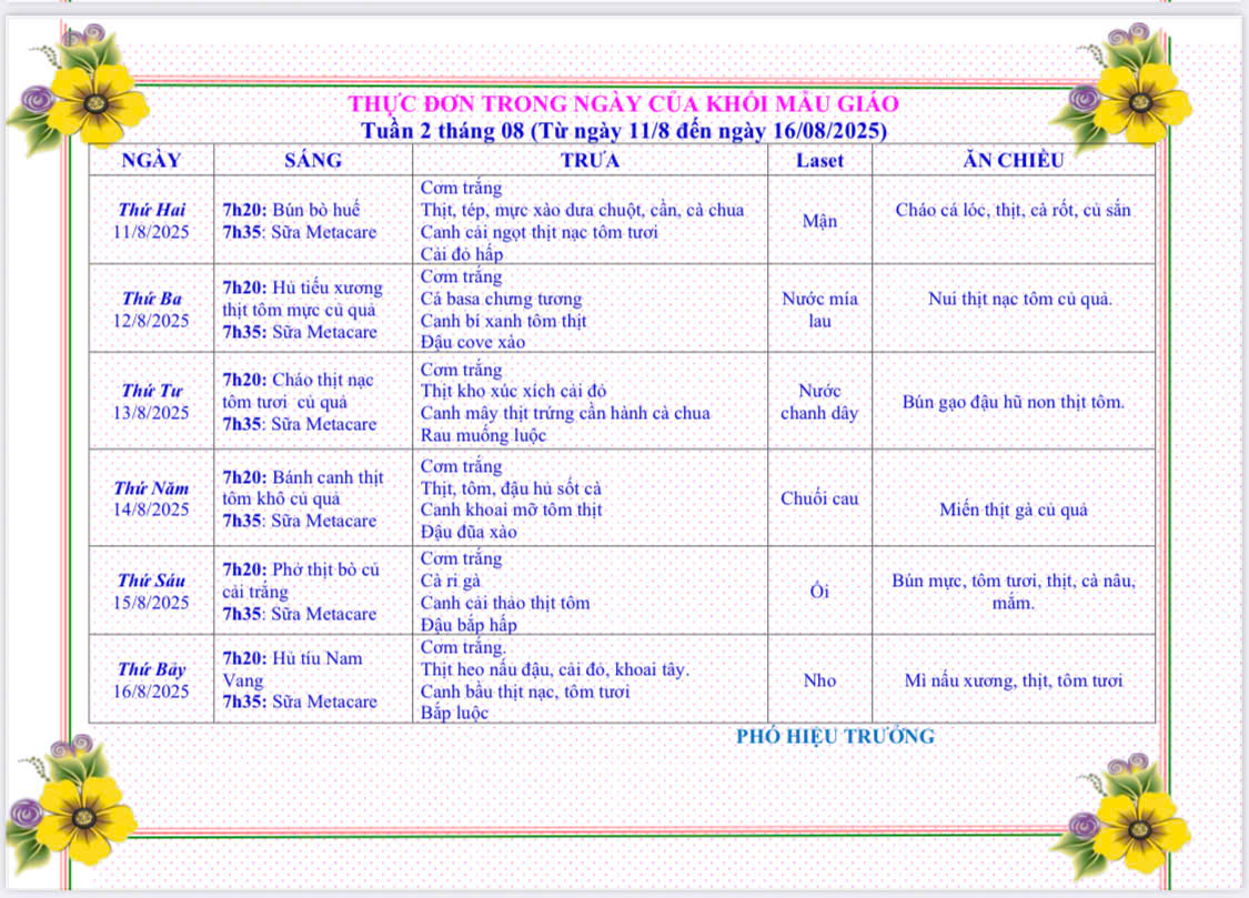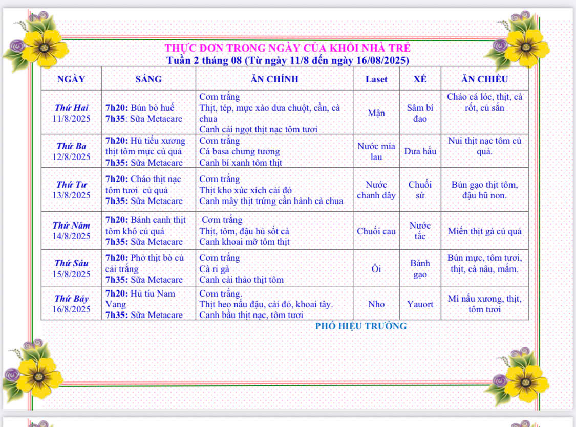 THỰC ĐƠN TỪ 11/8/2025 ĐẾN 16/8/2025