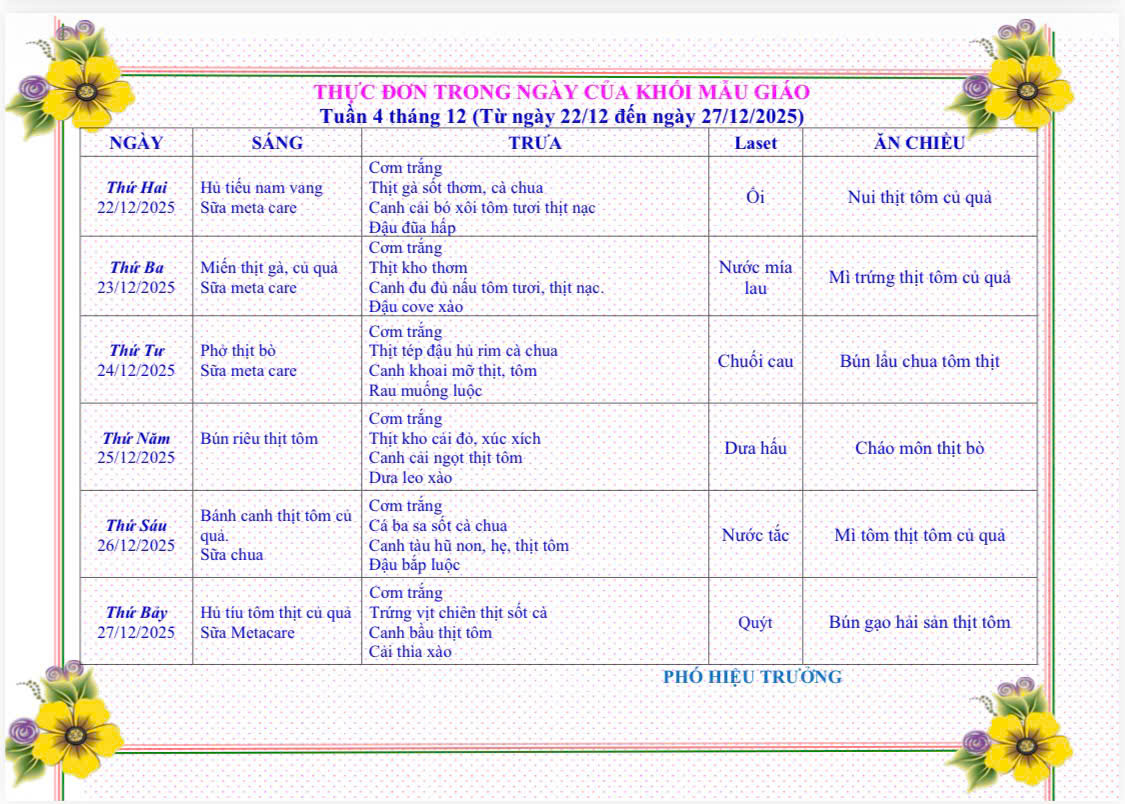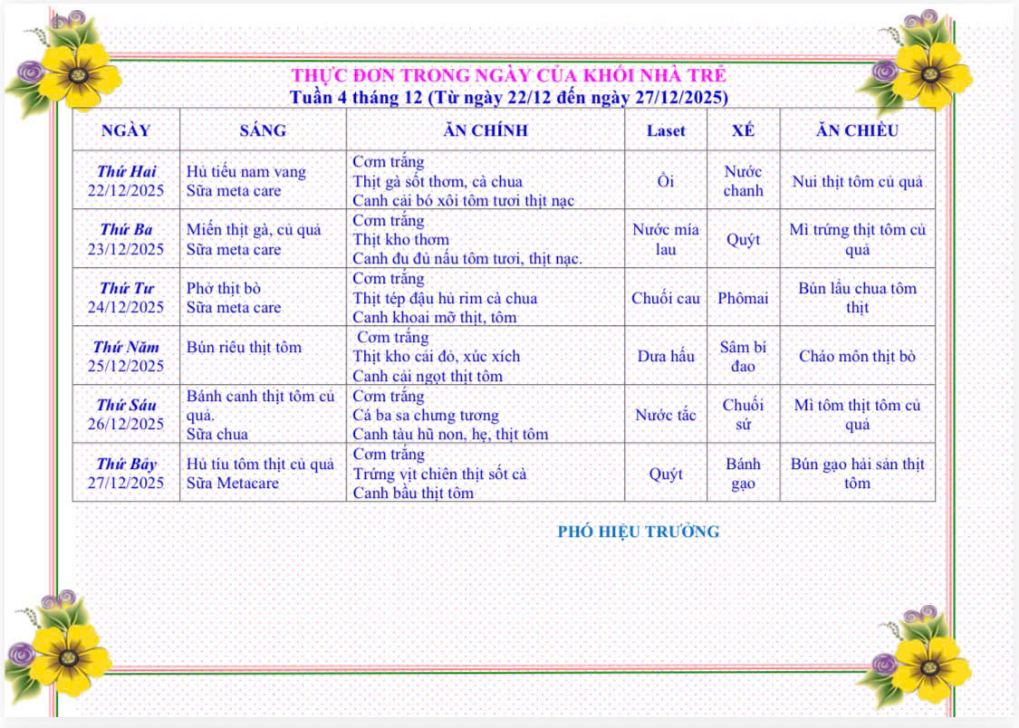 THỰC ĐƠN TỪ 22 THÁNG 12 ĐẾN 27 THÁNG 12 NĂM 2025