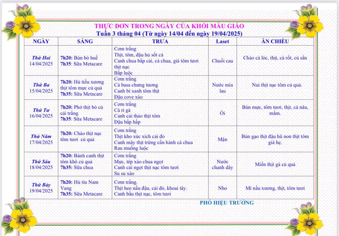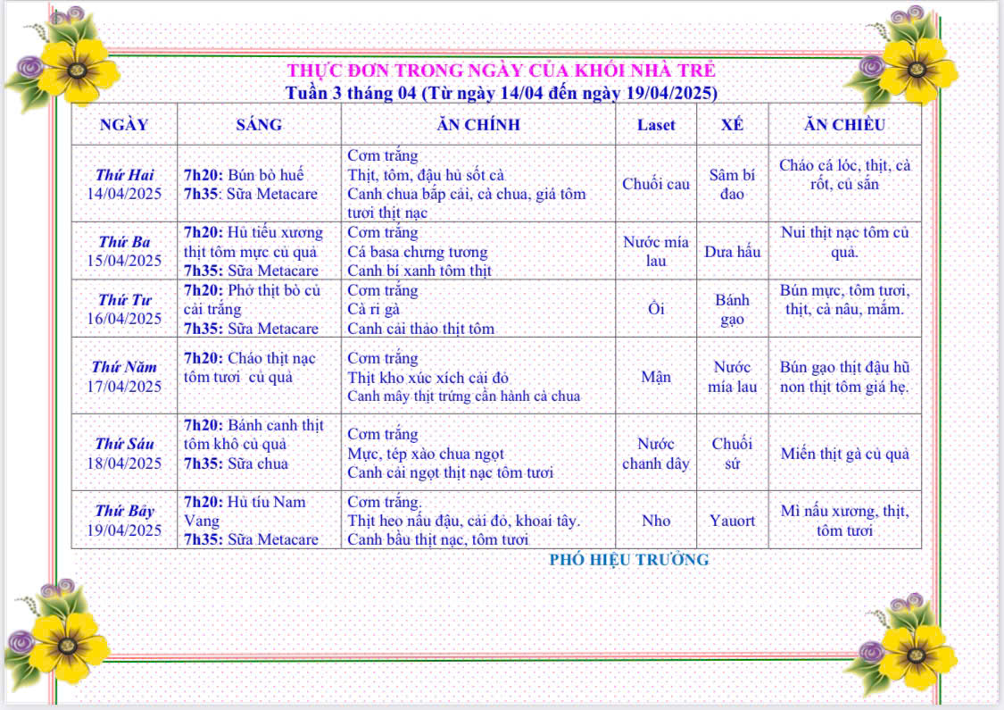 Bé và Phụ huynh, Bữa ăn của béThực đơn từ ngày 14 tháng 4 đến ngày 19 tháng 4 năm 2025 Posted on 05/05/2025 by tuyethanh Xem thêm: Hình ảnh Khối Hành Chính Quản Trị THỰC ĐƠN TỪ NGÀY 8/9/2025 ĐẾN NGÀY 13/9/2025 CHA MẸ TRẺ TÀI TRỢ CÂY XANH, BÁNH KẸO, ĐÁ, SỎI….. Xây dựng môi trường giáo dục lấy trẻ làm trung tâm ở trường mầm non THỰC ĐƠN TỪ 11/8/2025 ĐẾN 16/8/2025 Bài viết cùng chủ đề: THỰC ĐƠN TỪ 1 THÁNG 12 ĐẾN 6 THÁNG 12 NĂM 2025 THỰC ĐƠN TỪ 24 THÁNG 11 ĐẾN 29 THÁNG 11 NĂM 2025 THỰC ĐƠN TỪ 17 THÁNG 11 ĐẾN 22 THÁNG 11 NĂM 2025 THỰC ĐƠN TỪ 10 THÁNG 11 ĐẾN 15 THÁNG 11 NĂM 2025 BÉ VUI TRUNG THU NĂM HỌC 2025 – 2026 Chương trình xiếc – múa rối – ảo thuật cho các bé nhân dịp tết trung thu THỰC ĐƠN TỪ NGÀY 3 THÁNG 11 ĐẾN NGÀY 8 THÁNG 11 NĂM 2025 THỰC ĐƠN TỪ 27 THÁNG 10 ĐẾN NGÀY 1 THÁNG 11 NĂM 2025 THỰC ĐƠN TỪ NGÀY 20 THÁNG 10 ĐẾN NGÀY 25 THÁNG 10 NĂM 2025 THỰC ĐƠN TỪ 13 THÁNG 10 ĐẾN 18 THÁNG 10 NĂM 2025 THỰC ĐƠN TỪ 06 THÁNG 10 ĐẾN 11 THÁNG 10 NĂM 2025 THỰC ĐƠN TỪ 29 THÁNG 9 ĐẾN 4 THÁNG 10 NĂM 2025 PHÒNG BỆNH TAY CHÂN MIỆNG CHO TRẺ HOẠT ĐỘNG ROBOTICS – NUÔI DƯỠNG TƯ DUY KHOA HỌC CHO TRẺ THỰC ĐƠN TỪ NGÀY 22/9/2025 ĐẾN NGÀY 27/9/2025 THỰC ĐƠN TỪ NGÀY 15/9/2025 ĐẾN NGÀY 20/9/2025 Công tác phối hợp chăm sóc sức khỏe cho các bé năm học 2024 – 2025 THỰC ĐƠN TỪ NGÀY 21 THÁNG 4 ĐẾN NGÀY 26 THÁNG 4 NĂM 2025