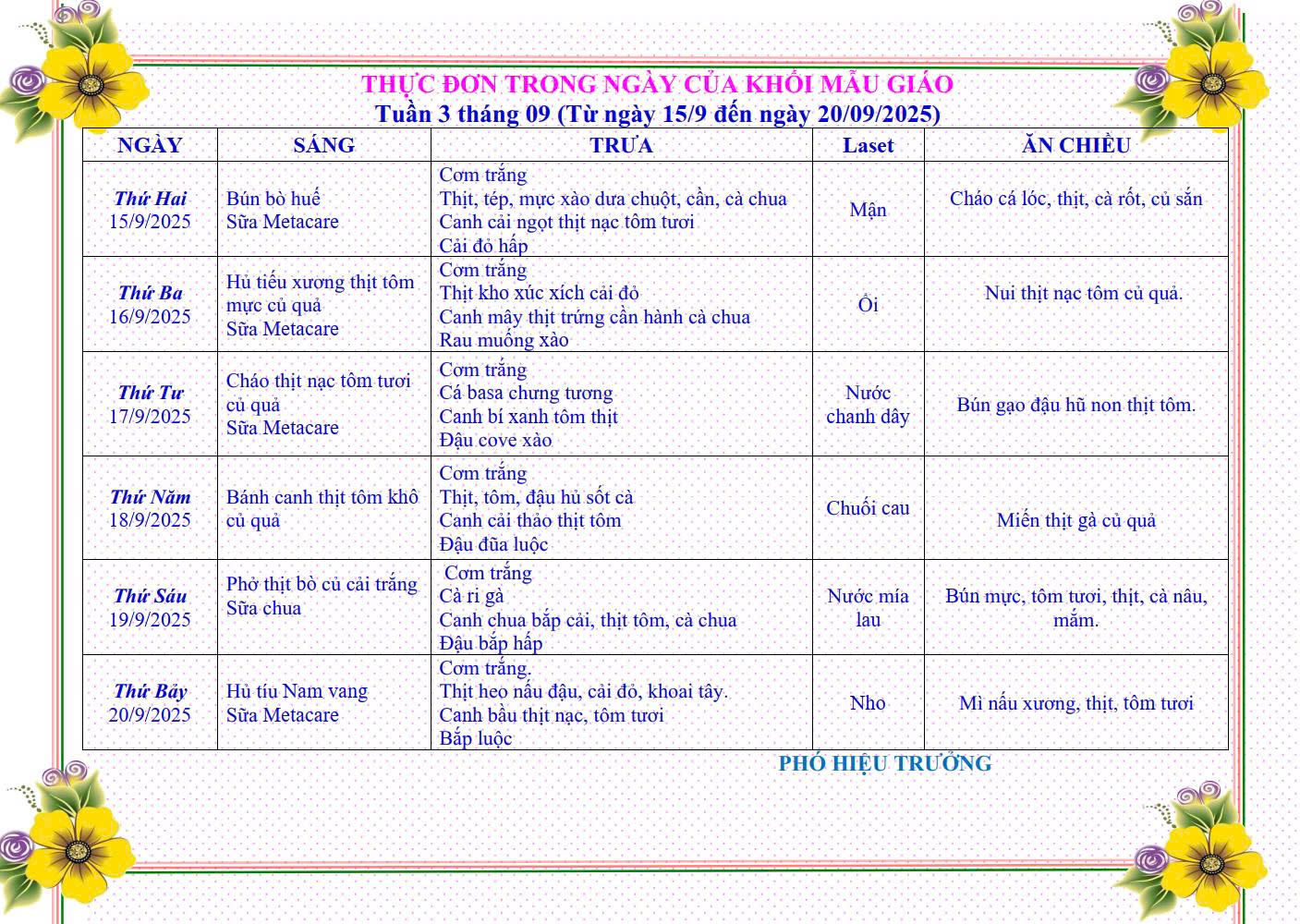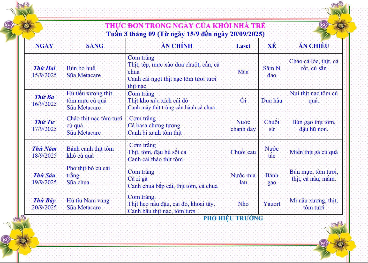 THỰC ĐƠN TỪ NGÀY 15/9/2025 ĐẾN NGÀY 20/9/2025