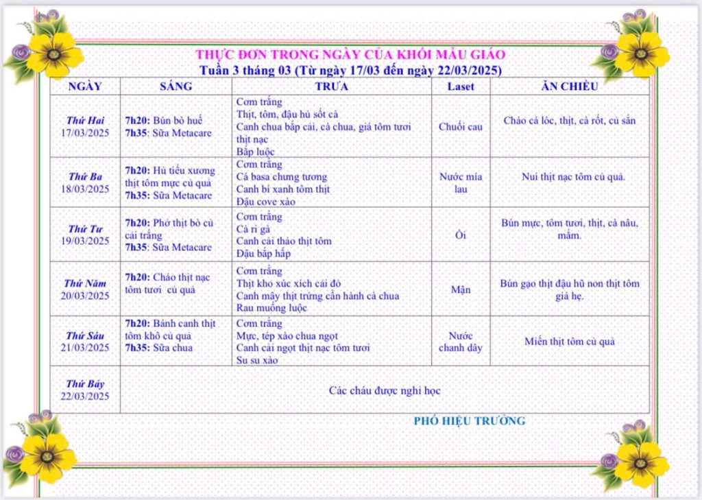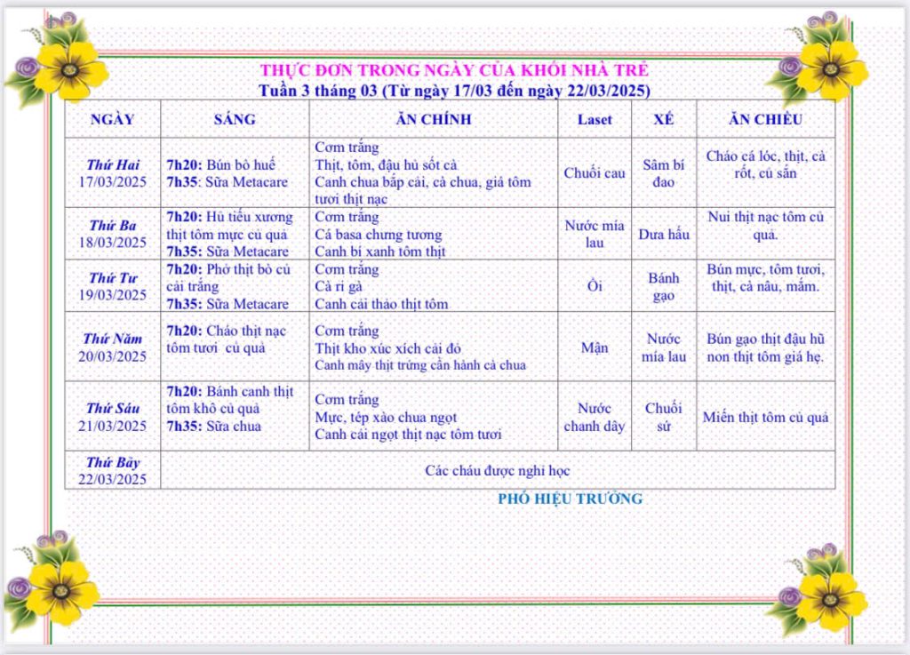 Bữa ăn của béTHỰC ĐƠN TỪ NGÀY 17 THÁNG 03 NĂM 2025 ĐẾN NGÀY 22 THÁNG 03 NĂM 2025 Posted on 27/03/2025 by tuyethanh Xem thêm: Khen Thưởng Đảng, Các Đoàn Thể và Cá nhân của Trường Cha mẹ trẻ cùng Chính quyền tham gia Lễ hội THỰC ĐƠN TỪ 17 THÁNG 11 ĐẾN 22 THÁNG 11 NĂM 2025 Hoạt động Trải nghiệm của Trẻ TẾT YÊU THƯƠNG – CHIA SẺ NIỀM VUI Bài viết cùng chủ đề: THỰC ĐƠN TỪ 1 THÁNG 12 ĐẾN 6 THÁNG 12 NĂM 2025 THỰC ĐƠN TỪ 24 THÁNG 11 ĐẾN 29 THÁNG 11 NĂM 2025 THỰC ĐƠN TỪ 17 THÁNG 11 ĐẾN 22 THÁNG 11 NĂM 2025 THỰC ĐƠN TỪ 10 THÁNG 11 ĐẾN 15 THÁNG 11 NĂM 2025 THỰC ĐƠN TỪ NGÀY 3 THÁNG 11 ĐẾN NGÀY 8 THÁNG 11 NĂM 2025 THỰC ĐƠN TỪ 27 THÁNG 10 ĐẾN NGÀY 1 THÁNG 11 NĂM 2025 THỰC ĐƠN TỪ NGÀY 20 THÁNG 10 ĐẾN NGÀY 25 THÁNG 10 NĂM 2025 THỰC ĐƠN TỪ 13 THÁNG 10 ĐẾN 18 THÁNG 10 NĂM 2025 THỰC ĐƠN TỪ 06 THÁNG 10 ĐẾN 11 THÁNG 10 NĂM 2025 THỰC ĐƠN TỪ 29 THÁNG 9 ĐẾN 4 THÁNG 10 NĂM 2025 THỰC ĐƠN TỪ NGÀY 22/9/2025 ĐẾN NGÀY 27/9/2025 THỰC ĐƠN TỪ NGÀY 15/9/2025 ĐẾN NGÀY 20/9/2025 THỰC ĐƠN TỪ NGÀY 8/9/2025 ĐẾN NGÀY 13/9/2025 THỰC ĐƠN TỪ NGÀY 1/9/2025 ĐẾN NGÀY 6/9/2025 THỰC ĐƠN TỪ 11/8/2025 ĐẾN 16/8/2025 THỰC ĐƠN TỪ NGÀY 4/8 ĐẾN 9/8/2025 ĐÓN ĐOÀN THANH TRA CHUYÊN MÔN CỦA PHÒNG GIÁO DỤC VÀ ĐÀO TẠO THÀNH PHỐ DĨ AN THỰC ĐƠN TỪ NGÀY 24 THÁNG 03 NĂM 2025 ĐẾN NGÀY 29 THÁNG 03 NĂM 2025
