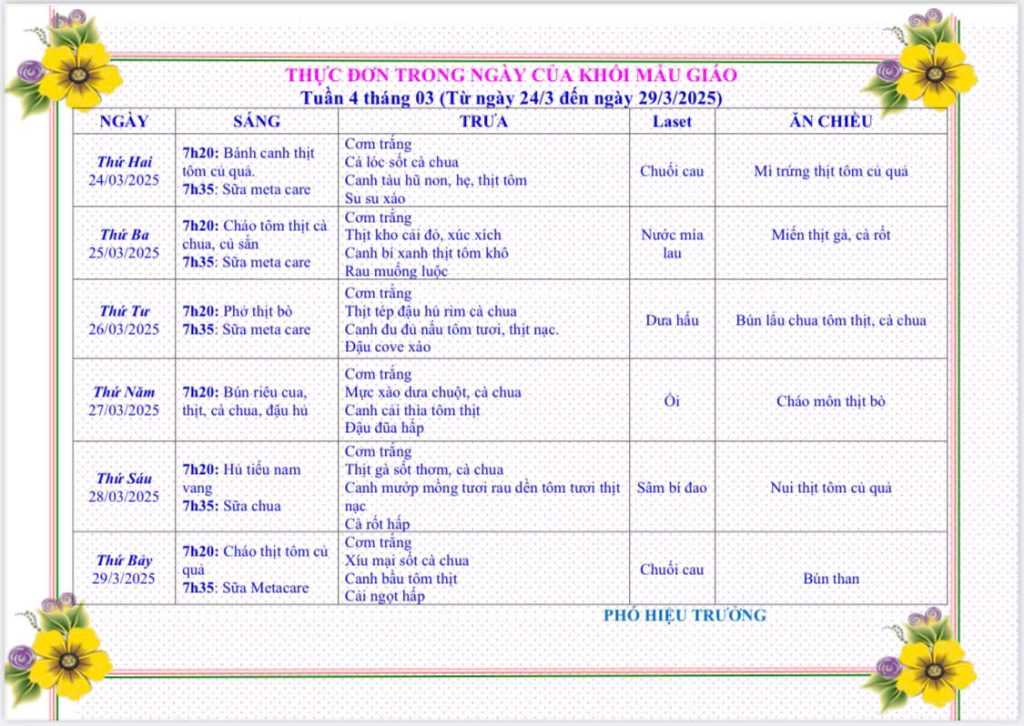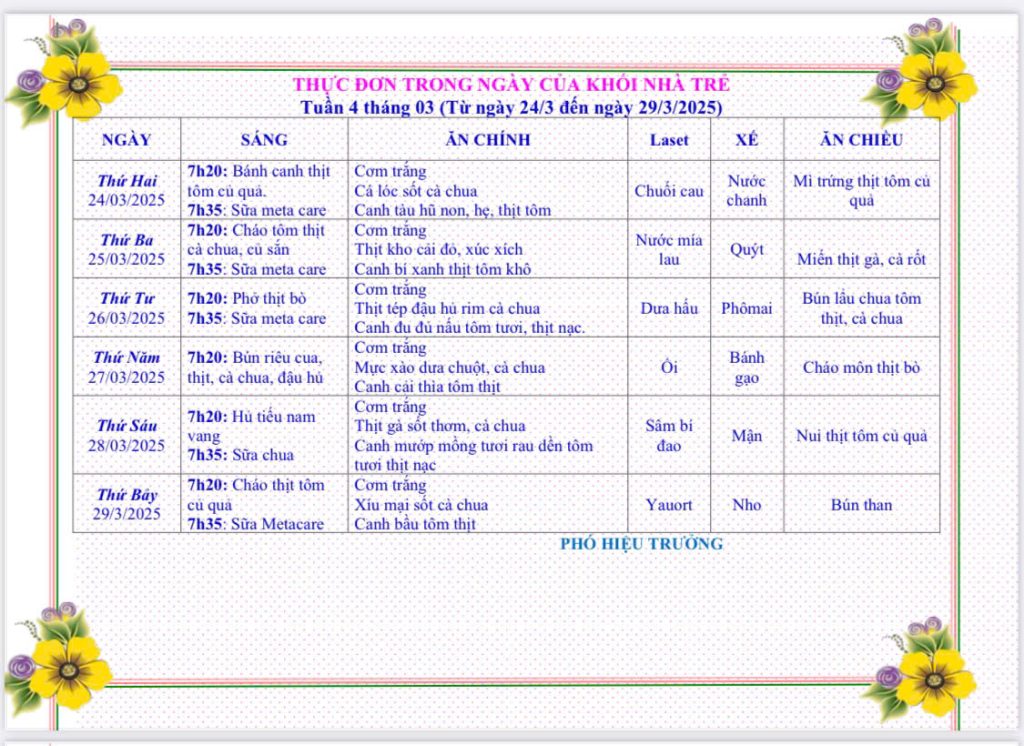 Bữa ăn của béTHỰC ĐƠN TỪ NGÀY 24 THÁNG 03 NĂM 2025 ĐẾN NGÀY 29 THÁNG 03 NĂM 2025 Posted on 27/03/2025 by tuyethanh Xem thêm: Thực đơn cho các bé từ ngày 9 đến ngày 13 tháng 9 năm 2024 Bữa ăn của bé từ ngày 28-10 đến ngày 02-11 năm 2024 LỄ TỔNG KẾT NĂM HỌC TRƯỜNG MẦM NON VÕ THỊ SÁU THỰC ĐƠN TỪ 29 THÁNG 9 ĐẾN 4 THÁNG 10 NĂM 2025 THỰC ĐƠN TỪ NGÀY 20 THÁNG 1 ĐẾN NGÀY 24 THÁNG 1 NĂM 2025 Bài viết cùng chủ đề: THỰC ĐƠN TỪ 1 THÁNG 12 ĐẾN 6 THÁNG 12 NĂM 2025 THỰC ĐƠN TỪ 24 THÁNG 11 ĐẾN 29 THÁNG 11 NĂM 2025 THỰC ĐƠN TỪ 17 THÁNG 11 ĐẾN 22 THÁNG 11 NĂM 2025 THỰC ĐƠN TỪ 10 THÁNG 11 ĐẾN 15 THÁNG 11 NĂM 2025 THỰC ĐƠN TỪ NGÀY 3 THÁNG 11 ĐẾN NGÀY 8 THÁNG 11 NĂM 2025 THỰC ĐƠN TỪ 27 THÁNG 10 ĐẾN NGÀY 1 THÁNG 11 NĂM 2025 THỰC ĐƠN TỪ NGÀY 20 THÁNG 10 ĐẾN NGÀY 25 THÁNG 10 NĂM 2025 THỰC ĐƠN TỪ 13 THÁNG 10 ĐẾN 18 THÁNG 10 NĂM 2025 THỰC ĐƠN TỪ 06 THÁNG 10 ĐẾN 11 THÁNG 10 NĂM 2025 THỰC ĐƠN TỪ 29 THÁNG 9 ĐẾN 4 THÁNG 10 NĂM 2025 THỰC ĐƠN TỪ NGÀY 22/9/2025 ĐẾN NGÀY 27/9/2025 THỰC ĐƠN TỪ NGÀY 15/9/2025 ĐẾN NGÀY 20/9/2025 THỰC ĐƠN TỪ NGÀY 8/9/2025 ĐẾN NGÀY 13/9/2025 THỰC ĐƠN TỪ NGÀY 1/9/2025 ĐẾN NGÀY 6/9/2025 THỰC ĐƠN TỪ 11/8/2025 ĐẾN 16/8/2025 THỰC ĐƠN TỪ NGÀY 4/8 ĐẾN 9/8/2025 THỰC ĐƠN TỪ NGÀY 17 THÁNG 03 NĂM 2025 ĐẾN NGÀY 22 THÁNG 03 NĂM 2025 Dự họp mặt kỷ niệm 94 năm Ngày thành lập Đoàn TNCS Hồ Chí Minh (26/03/1931 – 26/03/2025) và Nhận Tuyên dương “Hoa Tháng Ba” năm 2025.
