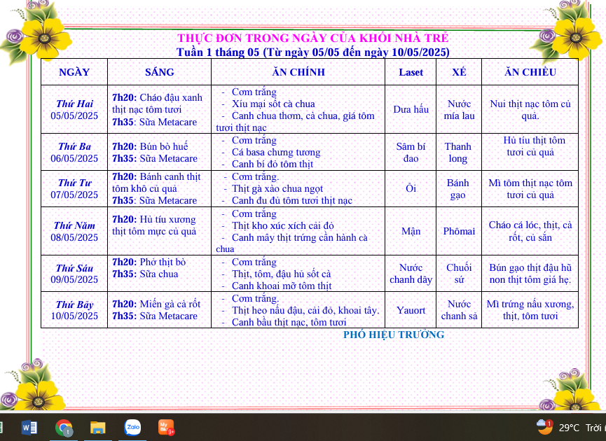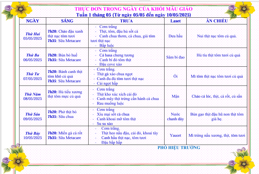 Bé và Phụ huynh, Bữa ăn của béThực đơn từ ngày 5 tháng 5 đến ngày 10 tháng 5 năm 2025 Posted on 05/05/2025 by tuyethanh Xem thêm: THAM GIA HỘI XUÂN ĐOÀN PHƯỜNG DĨ AN NĂM 2025 THỰC ĐƠN TỪ 17 THÁNG 11 ĐẾN 22 THÁNG 11 NĂM 2025 Ba mẹ cùng phối hợp hướng dẫn con các kỹ năng trong công tác phòng cháy chữa cháy để cùng đảm bảo an toàn! THỰC ĐƠN TỪ NGÀY 21 THÁNG 4 ĐẾN NGÀY 26 THÁNG 4 NĂM 2025 Kế hoạch đào tạo bồi dưỡng năm 2025 Bài viết cùng chủ đề: THỰC ĐƠN TỪ 1 THÁNG 12 ĐẾN 6 THÁNG 12 NĂM 2025 THỰC ĐƠN TỪ 24 THÁNG 11 ĐẾN 29 THÁNG 11 NĂM 2025 THỰC ĐƠN TỪ 17 THÁNG 11 ĐẾN 22 THÁNG 11 NĂM 2025 THỰC ĐƠN TỪ 10 THÁNG 11 ĐẾN 15 THÁNG 11 NĂM 2025 BÉ VUI TRUNG THU NĂM HỌC 2025 – 2026 Chương trình xiếc – múa rối – ảo thuật cho các bé nhân dịp tết trung thu THỰC ĐƠN TỪ NGÀY 3 THÁNG 11 ĐẾN NGÀY 8 THÁNG 11 NĂM 2025 THỰC ĐƠN TỪ 27 THÁNG 10 ĐẾN NGÀY 1 THÁNG 11 NĂM 2025 THỰC ĐƠN TỪ NGÀY 20 THÁNG 10 ĐẾN NGÀY 25 THÁNG 10 NĂM 2025 THỰC ĐƠN TỪ 13 THÁNG 10 ĐẾN 18 THÁNG 10 NĂM 2025 THỰC ĐƠN TỪ 06 THÁNG 10 ĐẾN 11 THÁNG 10 NĂM 2025 THỰC ĐƠN TỪ 29 THÁNG 9 ĐẾN 4 THÁNG 10 NĂM 2025 PHÒNG BỆNH TAY CHÂN MIỆNG CHO TRẺ HOẠT ĐỘNG ROBOTICS – NUÔI DƯỠNG TƯ DUY KHOA HỌC CHO TRẺ THỰC ĐƠN TỪ NGÀY 22/9/2025 ĐẾN NGÀY 27/9/2025 THỰC ĐƠN TỪ NGÀY 15/9/2025 ĐẾN NGÀY 20/9/2025 THỰC ĐƠN TỪ NGÀY 28 THÁNG 4 ĐẾN NGÀY 03 THÁNG 5 NĂM 2025 KẾ HOẠCH CHIẾN LƯỢC PHÁT TRIỂN NHÀ TRƯỜNG NĂM HỌC 2024-2025
